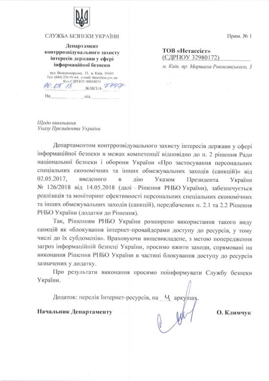 В июле 2018 года Служба безопасности Украины начала рассылать  украинским провайдерам предписание с требованием отключить доступ к 180 интернет-ресурсам. В предписании указывалось: «Решением СНБО Украины расширено использование такого вида санкций, как блокировка интернет-провайдерами доступа к интернет-ресурсам, в том числе к их субдоменам...  С целью предотвращения угроз информационной безопасности Украины просим принять меры, направленные на выполнение решения СНБО в части блокирования доступа к ресурсам».