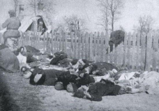 Видела глазами 4,5-летнего ребёнка эту чудовищную картину (с тех дней всё помню). На нескольких возах с решётками по бокам лежали, сложенные как ветки, трупы убитых людей. Телеги ехали медленно, за ними текла струя крови, и шли люди. В конце этого страшного кортежа шла отупевшая от отчаяния, скорби и напряжения моя мать, неся мёртвое тело своей дочки Галинки.
