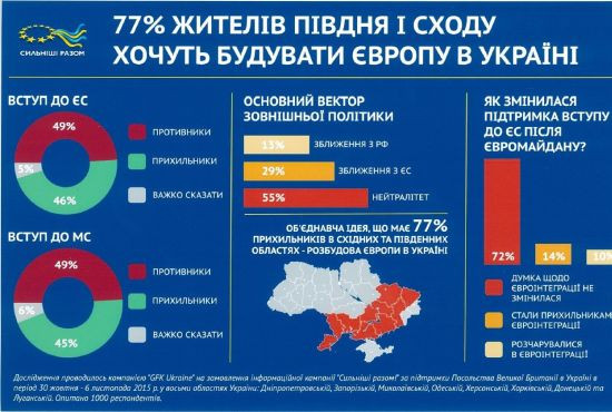 Л. Акуленко откровенно признается, что еще со времен Януковича социологи постоянно ломали голову над тем, как доносить идеи Соглашения об ассоциации с ЕС до жителей восточных областей Украины. «Когда мы начинали проводить свои социологические кампании совместно с GfK Ukraine, они были на грани срыва, потому что люди, слыша слово «евроинтеграция», отказывались участвовать в фокус-группах», – говорит она. То есть социолог откровенно признается, что юго-восток страны в большинстве своем всегда был против идеи евроинтеграции, и нисколько не смущается.