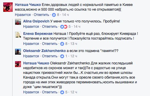 О подлости стоит сказать отдельно: Киевсовет блокирует ссылку на петицию, не давая возможности тысячам киевлян проголосовать против решения о переименовании проспекта Генерала Ватутина, а в адрес Елены Бережной в социальной сети уже посыпались угрозы от националистов.