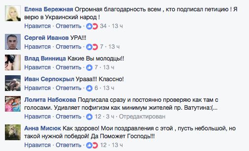 «Друзья! Наша с вами первая Победа! Сейчас судья Окружного административного суда вынес Определение о запрете ответчику - Киевсовету подписывать и публиковать решение от 1 июня о переименование проспекта легендарного Генерала Ватутина на Шухевича до рассмотрения дела в суде по сути! Это значит, что мэр Кличко это решение не подпишет и оно не вступит в законную силу! Значит, у нас есть возможность собрать вторую половину голосов за петицию и доказать, что Киеврада обязана считаться с нашим мнением!», сообщила Бережная.