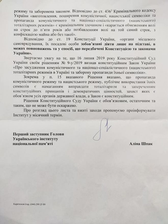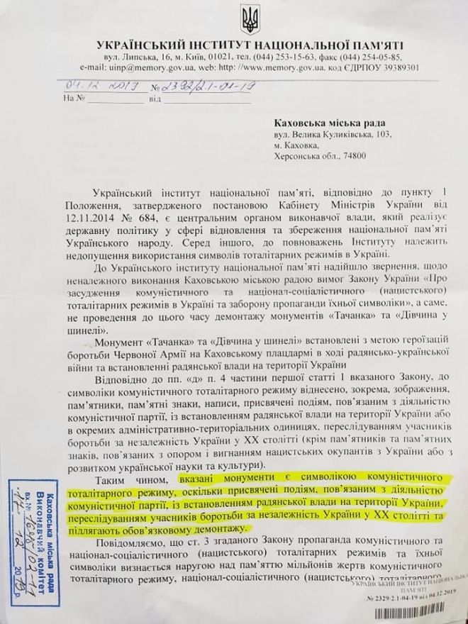 Но возвратимся к письму, направленному Херсонском горсовету. В нём, в частности, было отмечено: «Указанные монументы являются символикой коммунистического тоталитарного режима, поскольку посвящены событиям, связанным с деятельностью коммунистической партии по установлению советской власти на территории Украины, преследования участников борьбы за независимость Украины в XX веке».