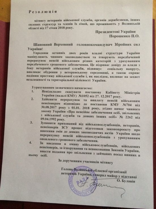 Участники акции приняли резолюцию, в которой говорится о том, что в течении последних двух лет властные структуры манипулируют действующим законодательством и игнорируют предусмотренный перерасчет пенсий военным различных категорий с учетом предусмотренного денежного обеспечения. Участники митинга просят президента безотлагательно отменить постановление Кабмина № 1052, осуществить перерасчет и выплату пенсий военным пенсионерам согласно постановлению № 704. Кроме того, они требуют за обман военнослужащих, военных пенсионеров, игнорирование и невыполнение законов внести представление об освобождении от должностей виновных в этом лиц. В частности, участники акции проголосовали за поддержку со снятия с должности министра соцполитики Андрея Ревы.
