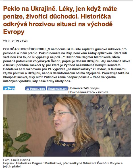 В чешской газете опубликовано интервью с историком Дагмар Мартинковой (Dagmar Martinková), которая часто бывает на Украине и знает о том, как живётся её гражданам. Историк возглавляет организацию, помогающую потомкам волынских чехов.