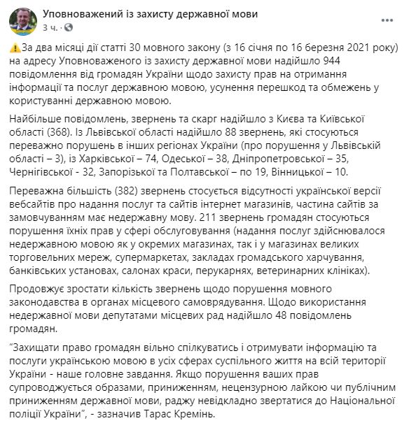 Защитников государственного языка не устраивает, например, отсутствие украинской версии веб-сайтов и интернет-магазинов. Об этом были 382 доноса. На русском языке «активистов» обслужили в 211 случаях. Касались жалобы магазинов, заведений общественного питания, банков, салонов красоты, ветеринарных клиник. В 48 доносах значилось, что депутаты местных советов используют при общении с электоратом русский язык. О, ужас!