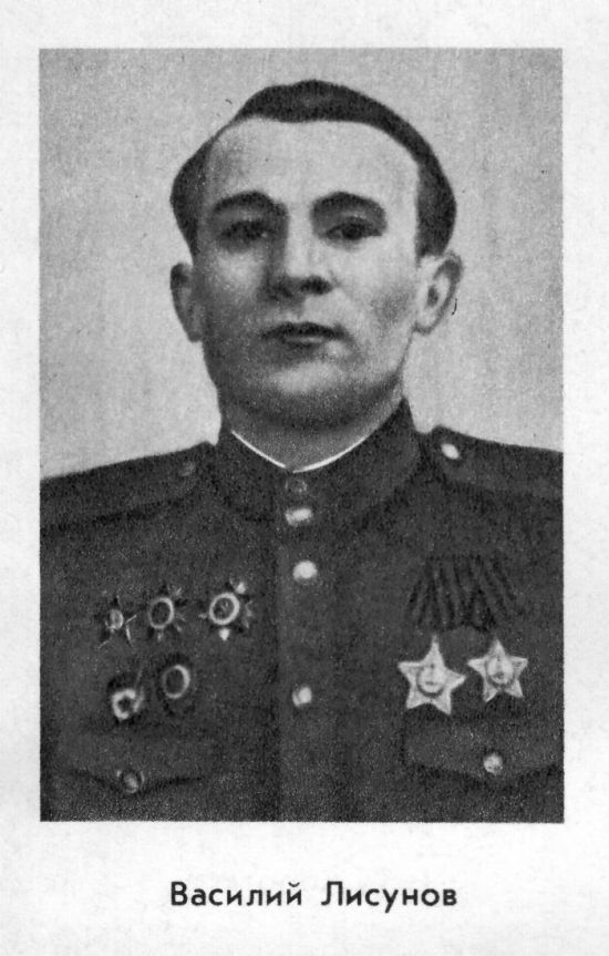 …Прошли садик, опустились в полуподвал, где была установлена зенитная пушка, и тут глазам открылась поразившая нас картина: на полу подвала мы увидели трупы четырёх гитлеровских солдат — орудийный расчёт в полном составе, а на казённой части орудия ничком лежал мёртвый боец бригады комсомолец Василий Лисунов, вцепившийся в горло фашистскому офицеру. С трудом разжали мы его пальцы, отбросили в сторону гитлеровца и вынесли на улицу тело отважного разведчика.