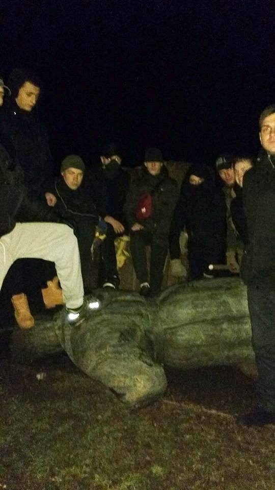 В ознаменовании своей «победы» над Федоровым молодые нацики оставили следы на лежащем памятнике дважды Герою Советского Союза, кто на теле, кто на спине, а кто и на голове.