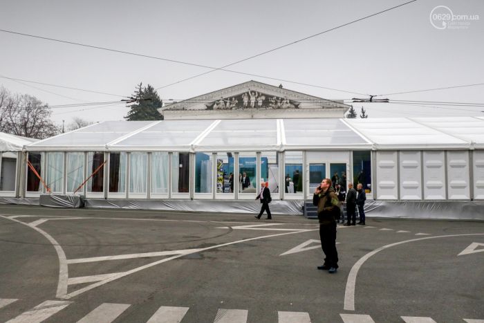 В Мариуполе президента ждали и готовились к его приезду заранее. Городские власти установили огромный белый шатёр в самом центре Мариуполя на площади возле драматического театра. Здесь и проходил форум.