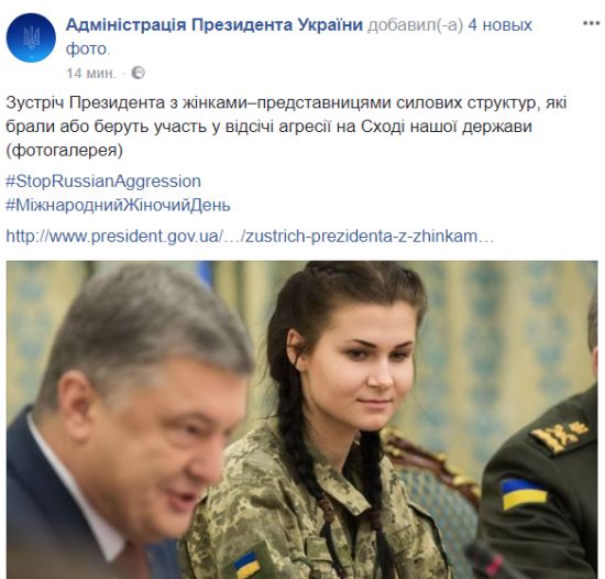 Даже президент Украины Пётр Порошенко поздравил украинок с праздником 8 марта, встретился с женщинами-военнослужащими, правда, не удержался от того, чтобы не упомянуть о «войне с Россией». В соцсети хэштег #StopRussianAggression он поставил перед #МіжнароднийЖіночийДень.