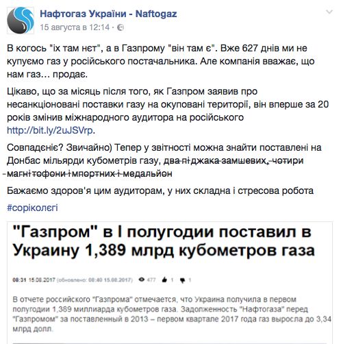 В ответ на заявление «Газпрома» пресс-служба НАК «Нафтогаз Украины» на своей странице в Facebook оставила издевательский комментарий о том, что «уже 627 дней мы не покупаем газ у российского поставщика. Но компания считает, что нам газ … продаёт». Кроме того, в «Нафтогазе» увидели связь между поставками российского газа в Донбасс и сменой аудита «Газпрома», по данным украинской компании, случившейся якобы через месяц после начала «несанкционированных поставок на оккупированные территории».