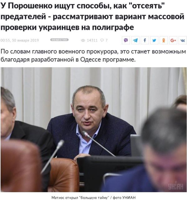 «Нужно придумать ноу-хау. Я открою сегодня большую тайну для всего государства. Сейчас в Одессе на базе одного достаточно мощного интеллектуально-научного центра разработана программа по принципу прохождения полиграфа на компьютере любым вменяемым человеком, который по определенному алгоритму реагирует на перечень вопросов. <…> Если Европа, мы найдём возможность и люди пройдут эти полиграфы…<…> Придется пропустить [через полиграф] все население, потому что сосед на соседа будет стучать, обижаться и мстить, потому что таковы реалии Украины»,- заявил Матиос.