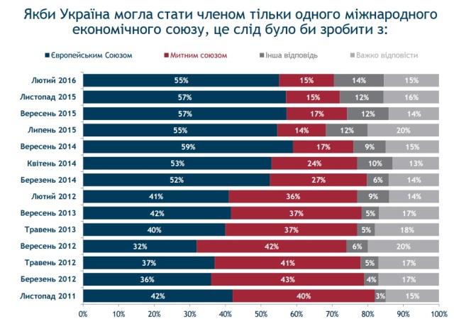 Так или примерно так происходит в любой отрасли производства, на какую ни посмотри. Но общество пока этого не осознало. Вступление в ЕАЭС  (Таможенный союз) поддерживают 15% граждан. Даже на востоке и юге страны сторонники ЕАЭС сейчас в меньшинстве – 30% и 25% соответственно. Большинство нацелено на Евросоюз.