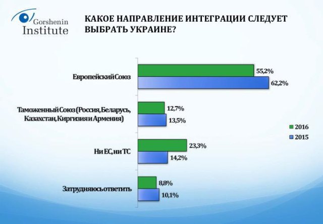 Подобные результаты получили социологи из Института Горшенина, несмотря на то, что вопрос был сформулирован так, как будто «направление интеграции»  еще не выбрано: «Какое направление интеграции следует выбрать Украине?» А почти четверть опрошенных уже не интересует ни ЕС, ни ЕАЭС.