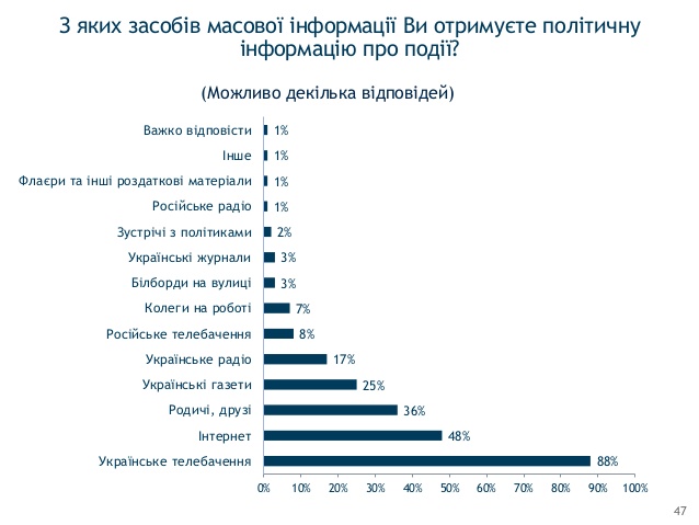 Машина украинской пропаганды заслуживает отдельных слов. Она устроена таким образом, что украинцы не знают правды ни о Евросоюзе, ни о России. Доминируют провластные СМИ, а оппозиционные либо закрыты, либо в целях самосохранения превратились в мнимо-оппозиционные, как, например, телеканалы «Интер», «Украина», «112». Впрочем, даже демонстрация верноподданности не спасает тот же «Интер» от регулярных нападений боевиков-неонацистов и поджогов. Вот данные того же опроса группы «Рейтинг» об источниках политической информации. Какие источники преобладают? Те, которые «украинские»…