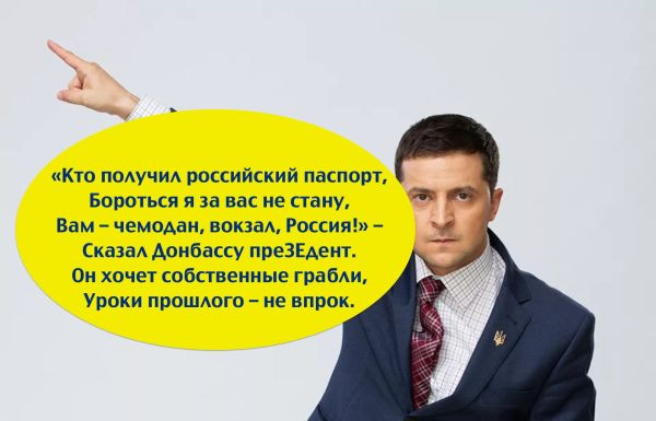 Не скрывая истинных намерений, Зеленский так и сказал: чемодан - вокзал – Россия! «Я верю и знаю, что там есть люди, которые за Украину. Также есть те, которые "потерялись". И, наконец, есть те, кто за Россию. Те, кто за Россию, могут поехать, Россия сейчас раздает нелегальные российские паспорта. Каждый человек имеет право выбирать, где он хочет жить», – заявил украинский президент, не объясняя, почему вдруг жители Донбасса должны покидать свои родные города и посёлки, решив стать российскими гражданами. Да и паспорта российские легальные, Россия кому хочет, тому их и раздаёт. Как и Украина. Как и США. Как и любая страна мира.