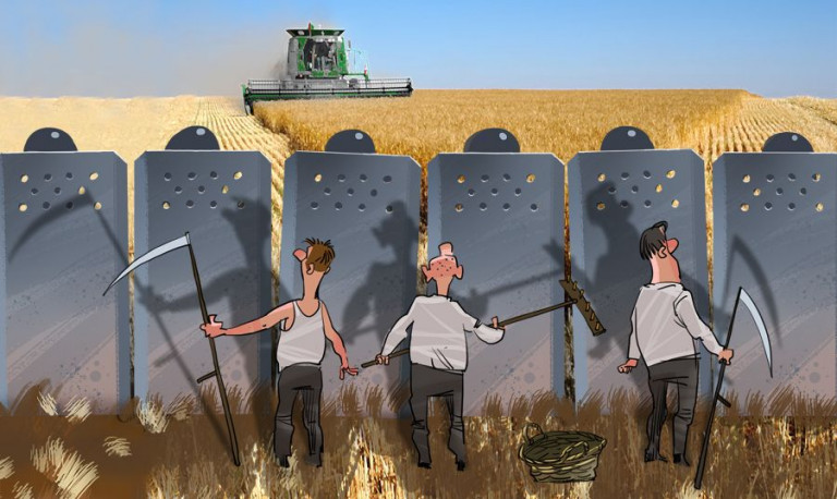 Новый закон о продаже земли сельскохозяйственного значения, принятый Верховной Радой 31 марта 2020 года и подписанный президентом Зеленским, уже заработал в полную силу. У фермеров начали отбирать не только землю, но и урожай. Так, в Черниговской области полиция разогнала протестующих крестьян, преградивших путь комбайнам к полям. Люди взяли кредиты, посеяли зерно, теперь некие бизнесмены хотят его отобрать вместе с землёй.