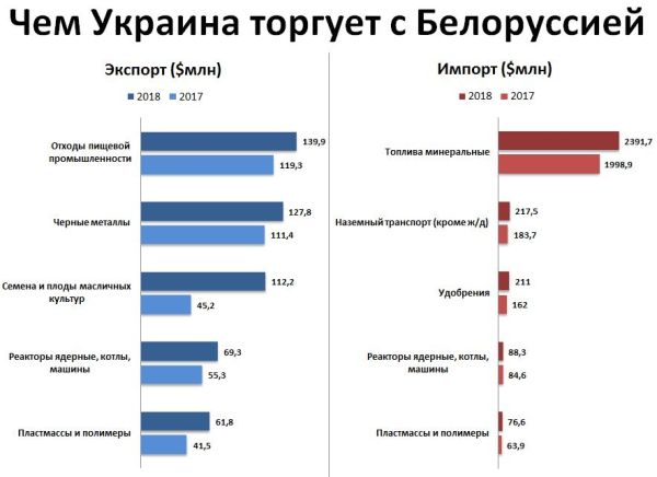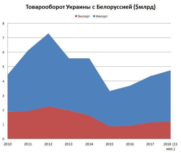 Скорее всего, А. Лукашенко имел в виду 2012 год, когда двусторонний товарооборот превысил $7 млрд., тогда как по итогам 2018-го он, скорее всего, достигнет $5 млрд. Особенностью украинско-белорусской торговли последние 10 лет было то, что ее баланс всегда был в пользу Минска. Для украинских экспортеров белорусский рынок не находится даже в десятке по объемам продаж, а вот по импорту Белоруссия прочно удерживает пятое место среди торговых партнеров Киева. Для Минска Украина второй по значимости после РФ экспортный рынок, что связано со структурой двустороннего товарооборота.