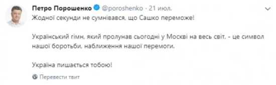 Порошенко в «Твиттере» объявил: «Ни секунды не сомневался, что Саша победит! Украинский гимн, который прозвучал сегодня в Москве на весь мир, - это символ нашей борьбы, приближение нашей победы. Украина гордится тобой! Поздравляю с победой, чемпион!»
