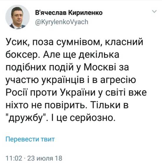 Нардеп Виталий Куприй, чью пользу для Украины сложно обнаружить даже с лупой, написал Усику открытое письмо, возмущался тем, что, «находясь в логове врага», тот не стал требовать вернуть Крым, освободить Донбасс и пленных. Причем сам Куприй этого отчего-то не делает, хотя мог бы купить билет до Москвы и начать требовать этого прямо на перроне Киевского вокзала. Видно, как говорится, «жим-жим» сработал…