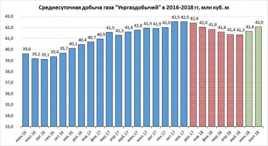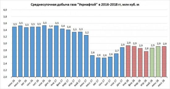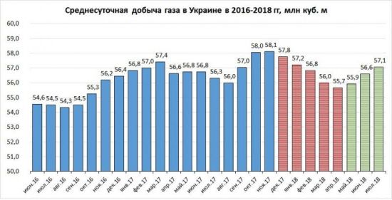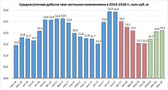 За январь-июль 2018 года добыча газа на Украине составила 11,971 млрд. кубов, что на 0,6% меньше, чем в январе-июне 2017-го. В «плюсе» только УГД (+0,7%). Сбавили производство частные компании (-2%), продолжает падать «Укрнафта» (-12,1%). Локальный перелом наступил в мае, когда пятимесячное падение среднесуточной добычи сменилось ростом, но, судя по волнообразной динамике последних лет, достичь уровня 27,5 млрд. кубов в 2020 году, предусмотренные правительственной Концепцией развития отрасли (утверждена в декабре 2016-го) газовикам вряд ли удастся.