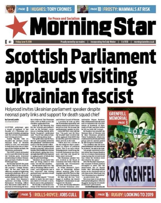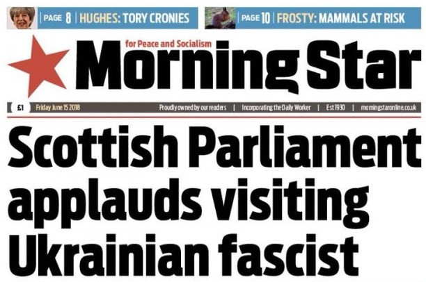 Так, газета Morning Star на первой полосе разместила статью под названием «Шотландский парламент аплодирует визиту украинского фашиста». Если же заглянуть на сайт издания, то вся поездка неонациста-спикера сопровождалась разоблачительными материалами об украинском нацизме. 15 июня увидели свет материал о том, что в шотландском парламенте принимают основателя неонацистской партии, и заметка о финансировании украинским властями неонацистских группировок. Об истинном отношении к Украине свидетельствует и появившаяся накануне приезда А. Парубия в авторитетнейшем британском издании The Times карта России с Крымом. Естественно, посол Украины Н. Галибаренко, прославившаяся нелепыми нарядами, тут же отозвалась протестом, потребовав у газеты изменить карту. Надо полагать, весь тираж был отозван, тщательно собран со столов лордов и биржевых воротил Сити и сожжен под крики «Слава Украине».
