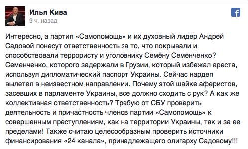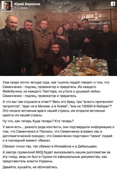 За участие в заговоре против дружественной страны требуют расстрела «донбассовцев» менее известные скакуны. Советник Порошенко Бирюков отмечает, что завтра Министерство иностранных дел Грузии будет высказывать претензии Украине, поскольку Семенченко находился на территории этой страны как официальный представитель украинской власти. Прикрытие обеспечено.