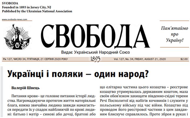 «Свобода» разместила статью «Украинцы и поляки – один народ?» некоего Валерия Швеца, который является доктором физико-математических наук. Он возглавлял в середине 1990-х годов одесскую областную организацию Народного руха Украины. Этот Швец пытается доказать, что русские не относятся к славянам, что русский и украинский народ практически не имеют никакого родства.  «Славянами, – пишет Швец, – по языку и по крови являются только украинцы, а московиты – народ угро-финно-тюркского происхождения, в настоящее время разговаривает на славянском языке, искусственно созданном на основе церковно-славянского языка».