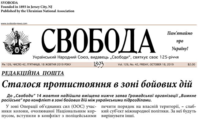 «В редакцию «Свободы», – сообщает старейшая украинская газета США, – поступило размещённое ниже заявление общественной организации «Выключи русское» о конфликте в зоне боевых действий между украинскими подразделениями: «В зоне операции объединенных сил (ООС) участники колонны, возглавляемой «Национальным корпусом», вступили в конфликт с полицейскими батальона «Миротворец», нарушив правила прохождения блокпоста в селе Кременная. Как следствие, один правоохранитель получил травмы, полиция была вынуждена делать предупредительные выстрелы в воздух. В конце концов, с целью деэскалации конфликта полицейские пропустили колонну в зону ООС. При этом только с одного проверенного автомобиля удалось изъять несколько единиц оружия, поэтому есть все основания считать, что с колонной в зону ООС было завезено ещё больше оружия… Демонстративное нарушение группой лиц режима безопасности ООС создаёт опасный прецедент и подрывает авторитет украинских силовых структур… Искусственный конфликт между добровольцами со стороны общественности и их собратьями-ветеранами, которые защищают правопорядок в зоне ООС, отнюдь не способствует национальному единству… Считаем это продолжением деструктивной деятельности, направленной на раскол украинского общества… Подобная дестабилизация выгодна прежде всего России… Ведь государство, которое не способно обеспечить порядок на собственной территории, – слабый субъект международной политики. За него будут решать другие. Появление в прифронтовой зоне ООС неофициальных вооружённых формирований (пусть и вооружённых только охотничьим оружием) полностью ложится в канву российских обвинений в адрес Украины… Дальнейшее пребывание участников этой акции на участке фронта будет иметь негативные последствия для государства, несет риски, в том числе для жизни гражданских лиц, и бесспорно вредит национальным интересам Украины. Украина – превыше всего!» (в оригинале – «Україна – понад усе!» – один из бандеровских лозунгов – С.Б.)».