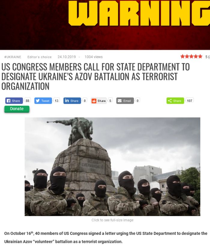 Дело в том, что «Свобода» издаётся в Соединённых Штатах. Является органом украинских националистов диаспоры, у которых хорошие связи в американском конгрессе. Особенно среди демократов. А в США разыгрался скандал, связанный с полком (до того батальоном) «Азов», на базе которого и возник «Нацкорпус». Сорок членов Конгресса США подписали обращение к госсекретарю Майку Помпео с требованием внести «Азов» в список иностранных террористических организаций наряду с ИГИЛ и «Аль-Каидой».
