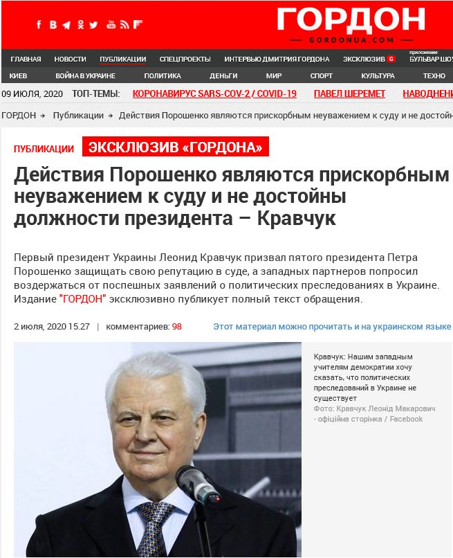 «А нашим западным учителям демократии, «защитникам» гонимых политических деятелей хочу сказать, что политических преследований в Украине не существует. Никто не пребывает за решеткой за свободомыслие, за личную позицию в жизни. Очнитесь, господа! Поскольку ваши предупреждения о недопустимости политических преследований в Украине звучат как-то странно и могут быть квалифицированы как вмешательство в наши внутренние дела. Свои проблемы мы сами будем решать, как суверенное независимое государство в строгом соответствии с украинским законодательством», – сказал бывший президент Украины. Конечно, Хитрый Лис (как называют Кравчука) лукавил – политические преследования на Украине есть, и развернулись они как раз при Порошенко. Но это не имеет отношения к делам, возбуждённым в отношении бывшего главы государства.