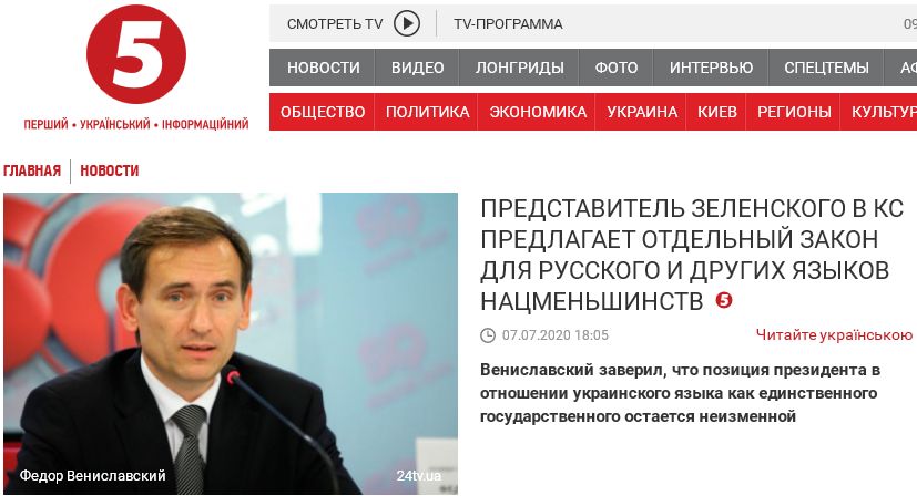 Сейчас ровно той же дорогой идёт и президент Владимир Зеленский. Хотя во время избирательной кампании он критиковал дискриминационные законы о языке, но по факту продолжил языковую политику Порошенко. Более того, когда Конституционный суд начал рассмотрение в открытом режиме скандального закона о функционировании украинского языка как государственного (так называемого закона о тотальной украинизации), то представитель президента Зеленского в Конституционном суде Федор Вениславский заявил: «Предметом правового регулирования закона является обеспечение функционирования украинского языка. Речь идёт исключительно об украинском языке. Предметом правового регулирования этого закона не является статус других языков. Никакого неравенства статуса языков национальных меньшинств в этом законе нет и быть не может».