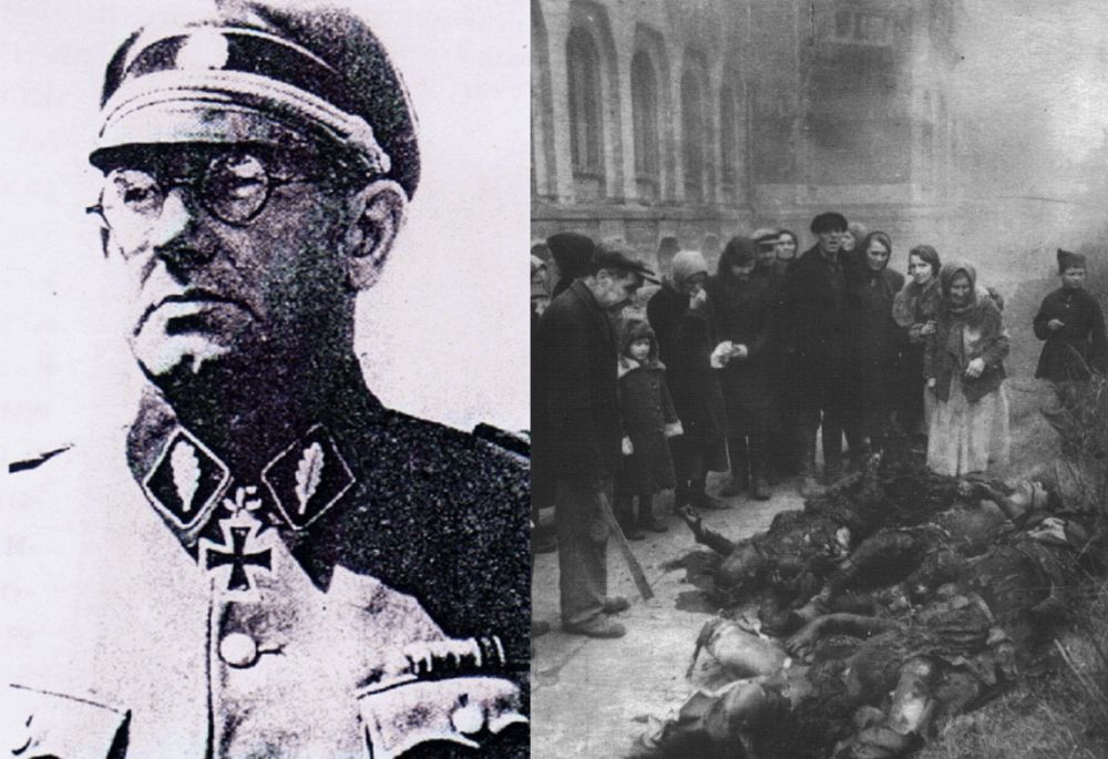 Главный обвиняемый на Полтавском процессе генерал-майор Хельмут Беккер; справа – тела полтавчан, убитых эсэсовцами, извлечённые из здания сожжённого фашистами краеведческого музея