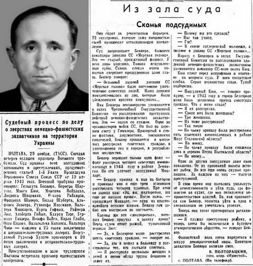 Сейчас же главными обвиняемыми стали бывший командир дивизии СС «Мёртвая голова» бригадефюрер СС (генерал-майор) Хельмут Беккер, командир полка этой же дивизии оберштурмбанфюрер СС (подполковник) Макс Кюн, бывший комендант главной полевой комендатуры № 397 генерал-лейтенант Вернер Шартов и ещё 19 их сослуживцев и подчинённых. Повесив головы и пряча глаза, они слушали всё новые и новые факты о своих злодеяниях, приводимые обвинителем: убийстве ими 200 военнопленных в селе Александровка Полтавского района и ещё 103-х военнопленных близ села Браиловичи Кировоградской области, о трагедии на мосту через Днепр, когда их танки давили гусеницами беззащитных женщин и детей, расстреле 300 мирных жителей на Белгородском шоссе и множестве других ужасных преступлениях. Крыть их ни им самим, ни их адвокатам было, в общем-то, нечем: разве что ссылкой на исполнение приказов. Но эта карта давно была бита: Нюрнбергский трибунал закрепил юридической нормой, что выполнение заведомо преступного приказа отнюдь не освобождает исполнителя от ответственности.