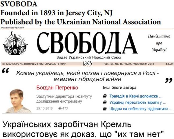 Газета украинских националистов в США «Свобода» и ряд других националистических СМИ разместили статью некоего Богдана Петренко, имеющего довольно своеобразную должность — заместитель директора Института исследования экстремизма. Статья называется «Как Кремль использует украинских заробитчан». Наверное, по замыслу властей придержащих Украины, именно Институт исследования экстремизма должен отныне заниматься гражданами, выехавшими на заработки в Российскую Федерацию.