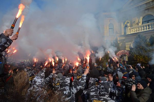 «Национальные дружины» 2 марта провели лёгкую разминку перед выбрами. В Киеве на Майдане Независимости они вывесили огромный банер «Свинарчуков Порошенко – за решётку!», намекая на коррупционный скандал в оборонной сфере, к которому причастна семья бизнес-партнёра Порошенко Олега Гладковского (до 2014 года носил фамилию Свинарчук).