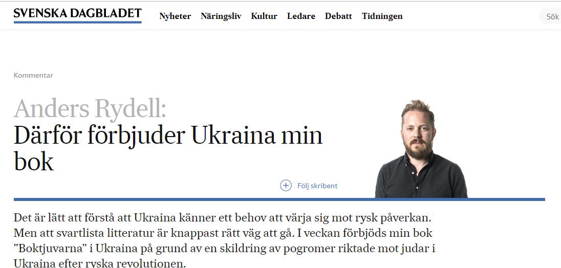 Рюддель пишет: «Я был немало удивлен, когда узнал, что русский перевод моей книги «Книжные воры» (Boktjuvarna) на днях запретили на Украине — вместе с 26 другими книгами, которые нельзя импортировать и продавать в стране.