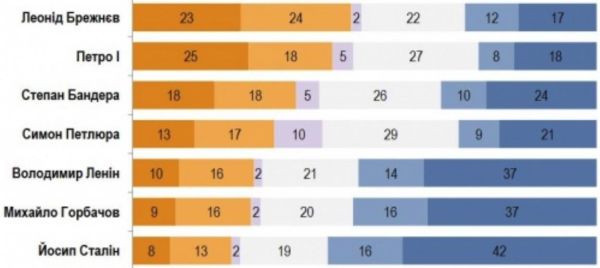 Отвечая на опросы социологов о любви и ненависти, 47% и 43% респондентов имеют положительное отношение к Леониду Брежневу и Петру I соответственно, 39% и 26% - отрицательное. К Степану Бандере положительно относятся 36% (отрицательно - 34%), к Симону Петлюре как положительно, так и отрицательно относятся по 30% респондентов.