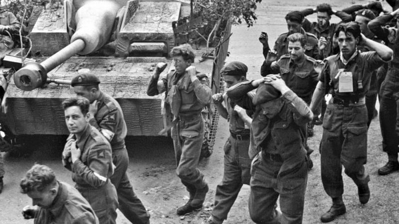 Пленные британские десантники из 1-й воздушно-десантной дивизии идут мимо немецкой САУ StuG III в Арнеме (Голландия)