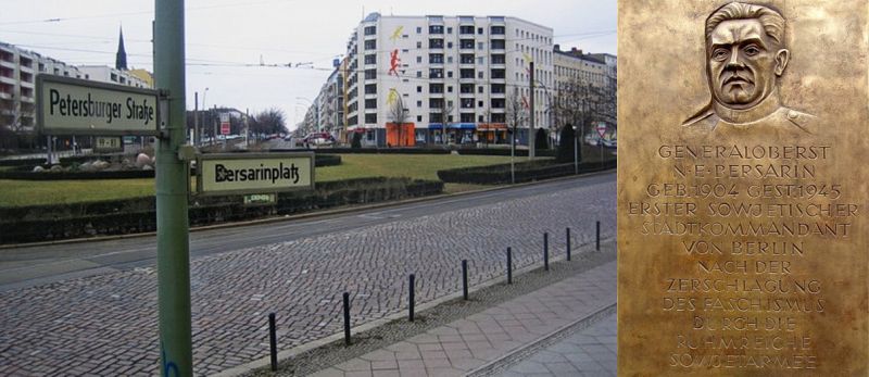 Площадь Берзарина (Bersarinplatz) и одна из мемориальных досок ему в Берлине.