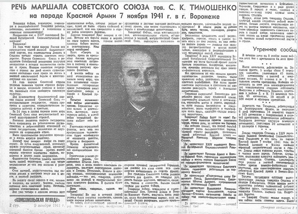 Речь маршала С.К. Тимошенко на параде 7 ноября 1941 года в Воронеже (газета «Комсомольская правда» за 9 ноября 1941 г.)