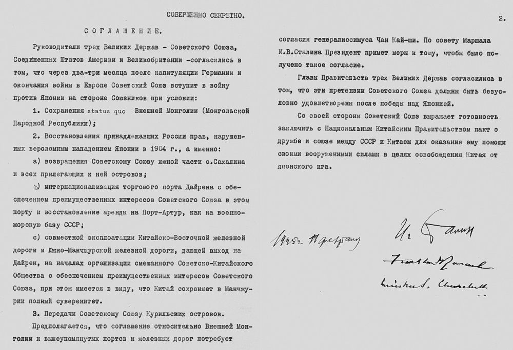 Протокол Ялтинского соглашения, подписанный Сталиным, Рузвельтом и Черчиллем, гарантирующий Советскому Союзу права и преимущества в случае вступления в войну на Дальнем Востоке
