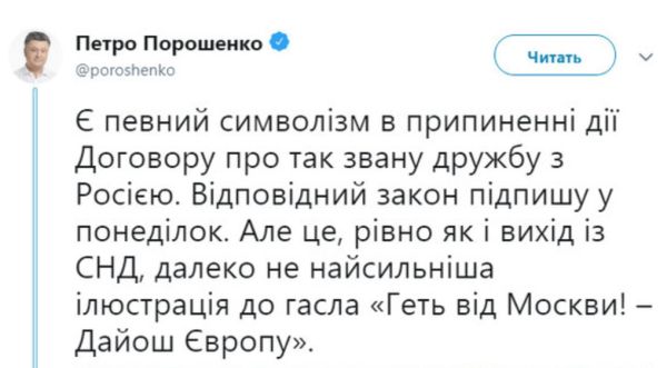 Договор о дружбе, сотрудничестве и партнёрстве между Украиной и Россией 1 апреля утратил силу: рассыпался пеплом и канул в Лету. На бумаге он существовал и частично действовал (никогда в полной мере) 20 лет. От продления отказалась украинская сторона, приняв соответствующий закон, который инициировал Пётр Порошенко.