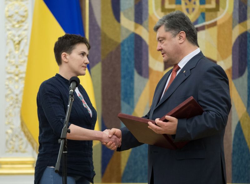 Президент Украины Пётр Порошенко награждает Надежду Савченко «Золотой Звездой» Героя Украины