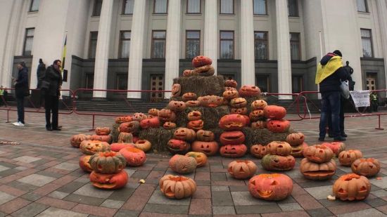Перед зданием Верховной Рады набросали гарбузов (тыкв). В одних палатках собрались какие-то гражданские, в других сидят типы в камуфляже. Горят буржуйки, на дворе уже не лето. По площади Конституция бродят какие-то люди с огромными цветастыми мешками.
