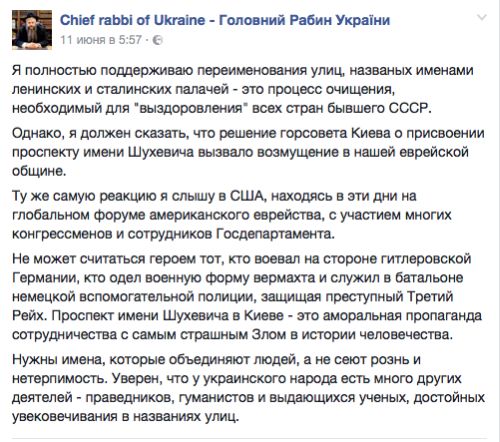 Главный раввин Украины Моше Реувен Асман, который поддерживает «декоммунизацию», комментируя «шухевизацию» Украины, заявил: «Не может считаться героем тот, кто воевал на стороне гитлеровской Германии, кто одел военную форму вермахта и служил в батальоне немецкой вспомогательной полиции, защищая преступный Третий Рейх. Проспект имени Шухевича в Киеве – это аморальная пропаганда сотрудничества с самым страшным злом в истории человечества».
