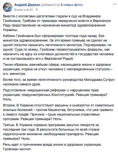 Народный депутат Андрей Деркач пояснил на своей странице в Facebook: «Кабмин Гройсмана был сформирован полтора года назад. Без министра здравоохранения. За это время премьер не сделал ни одной попытки назначить легитимного министра. Подчеркиваю: ни одной. Судя по всему, Гройсман – первооткрыватель формулы, как назначить на одну из ключевых должностей в государстве человека и не согласовывать его с Верховной Радой». Причём, депутат не видит кандидатуру Супрун оптимальной, так как за год она «наломала немало дров».