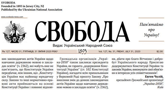«Общественная организация «Украина-2050» призывает всех депутатов Верховной Рады Украины уважать Конституцию Украины и напоминает всем сторонникам в Верховной Раде проекта закона «О внесении изменений в некоторые законодательные акты об обучении на государственном языке в учебных заведениях» (№ 2362), которые, видимо, уже не помнят, что Конституция Украины предусматривает, между прочим, что «Конституция Украины имеет высшую юридическую силу. Законы и иные нормативно-правовые акты принимаются на основе Конституции Украины и должны соответствовать ей» (ст. 8); и, что «государственным языком в Украине является украинский язык. Государство обеспечивает всестороннее развитие и функционирование украинского языка во всех сферах общественной жизни на всей территории Украины» (ст. 10). Общественная организация «Украина-2050» также призывает президента Украины, как гаранта «соблюдения Конституции Украины» (ст. 102), напомнить всем сторонникам в Верховной Раде проекта закона «О внесении изменений в некоторые законодательные акты об обучении на государственном языке в учебных заведениях», что согласно ст. 79 Конституции Украины все народные депутаты Украины должны принимать перед Верховной Радой Украины следующую присягу: «Присягаю на верность Украине. Обязуюсь всеми своими действиями отстаивать суверенитет и независимость Украины, заботиться о благе Отчизны и благосостоянии Украинского народа. Присягаю соблюдать Конституцию Украины и законы Украины, исполнять свои обязанности в интересах всех соотечественников»».