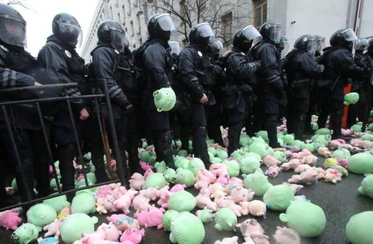 Актив «Нацкорпуса» ответил на обвинения в «промосковскости» системными креативными антипорошенковскими акциями, символами которых стала свинина: живая (как в Луцке), кусковая, которой швырялись в Полтаве, и плюшевая, которой забрасывали полицию и Нацгвардию под Верховной радой и администрацией президента в Киеве.