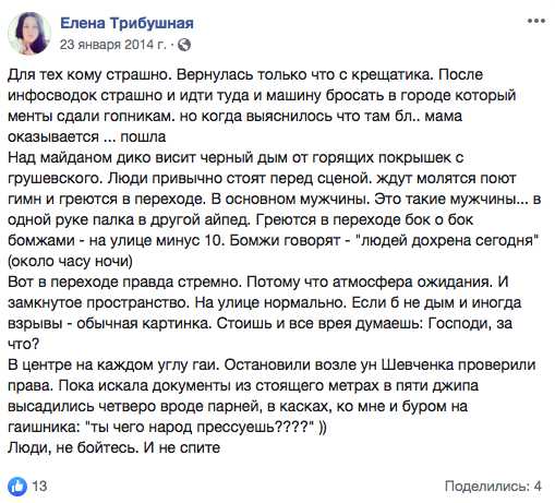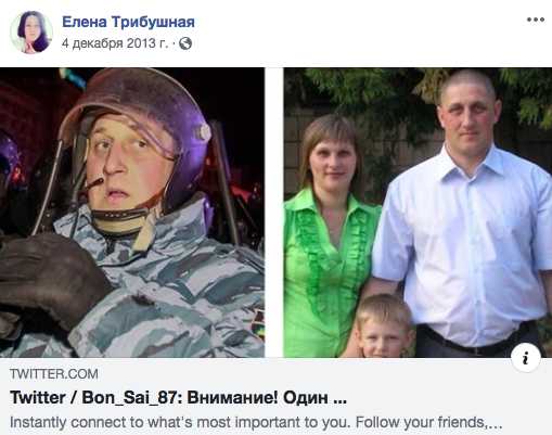 На стыке 2013-2014 гг. Елена вовсю агитировала за майдан и очень гордилась своим присутствием на этом «мероприятии», закончившимся госпереворотом в самый первый его день – 21 ноября 2013 года. А 4 декабря она уже постила снимки ненавистных майдановцам «беркутовцев», причём не только самих правоохранителей, но и вот, к примеру, жена и ребёнок. Маленький мальчик, фото которого пани Трибушная зачем-то решила обнародовать. Догадайтесь – зачем?