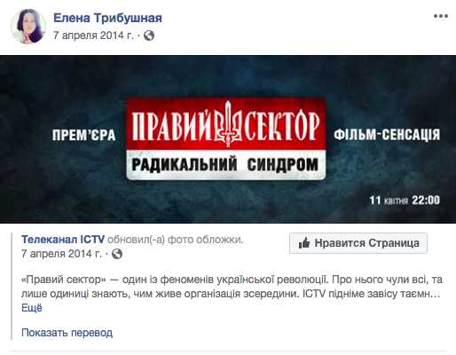 А это чуть позже, здесь она рекламирует «Правый сектор»*, вернее «фильм-сенсацию» про это бандформирование.